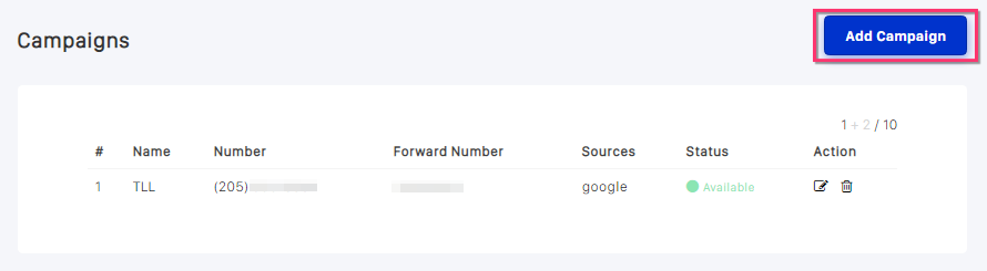 From your Novocall Dashboard, navigate to Call Tracking > Campaign to open the Campaign page. All campaigns you are tracking will be listed here.