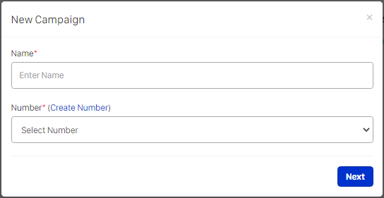 Upon creating a new campaign, you will be required to name the campaign and assign a number. If you any available numbers, you can select which you want to assign from the dropdown. Otherwise, you can purchase a new number by clicking on Create Number button.